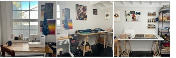 The title of this newsletter is a bit misleading. It’s not technically a new studio, but it’s a vastly improved studio! Thanks to a grant from The Craft Emergency Relief Fund, I was able to buy a new, heavy duty Janome sewing machine, some better lighting and an adjustable work table to use for sewing and drawing. And even some large storage shelves! These improvements will make a huge difference in my daily practice and it’s a delight to get back to work in this space!