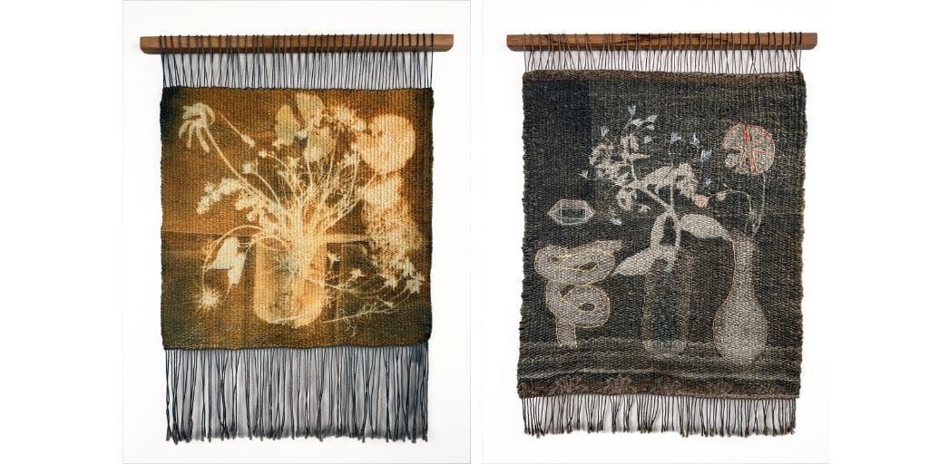 l’ll be showing these two weavings made during the early part of the pandemic in 2020. I was thinking a lot about the symbolism found in Dutch still life paintings at that time: borage, the blue starflower, represents courage, protection and renewal; the poppy is sleep, fragility and death; a snake symbolizes cycles of life and death; quartz is healing, balance and spiritual growth. The process of creating the weavings and then printing onto them via cyanotype was a form of much needed meditation. I’m so happy for the opportunity to show them!