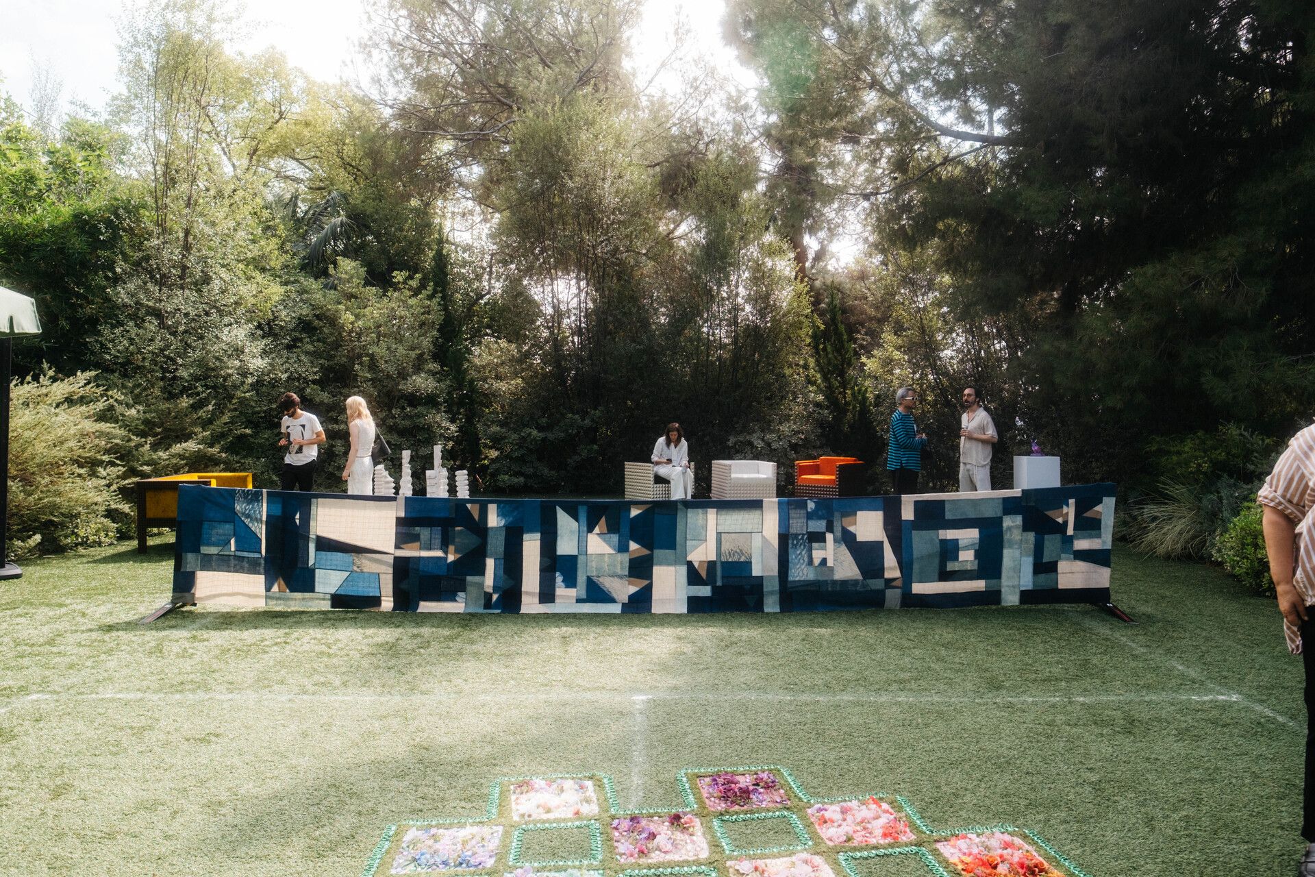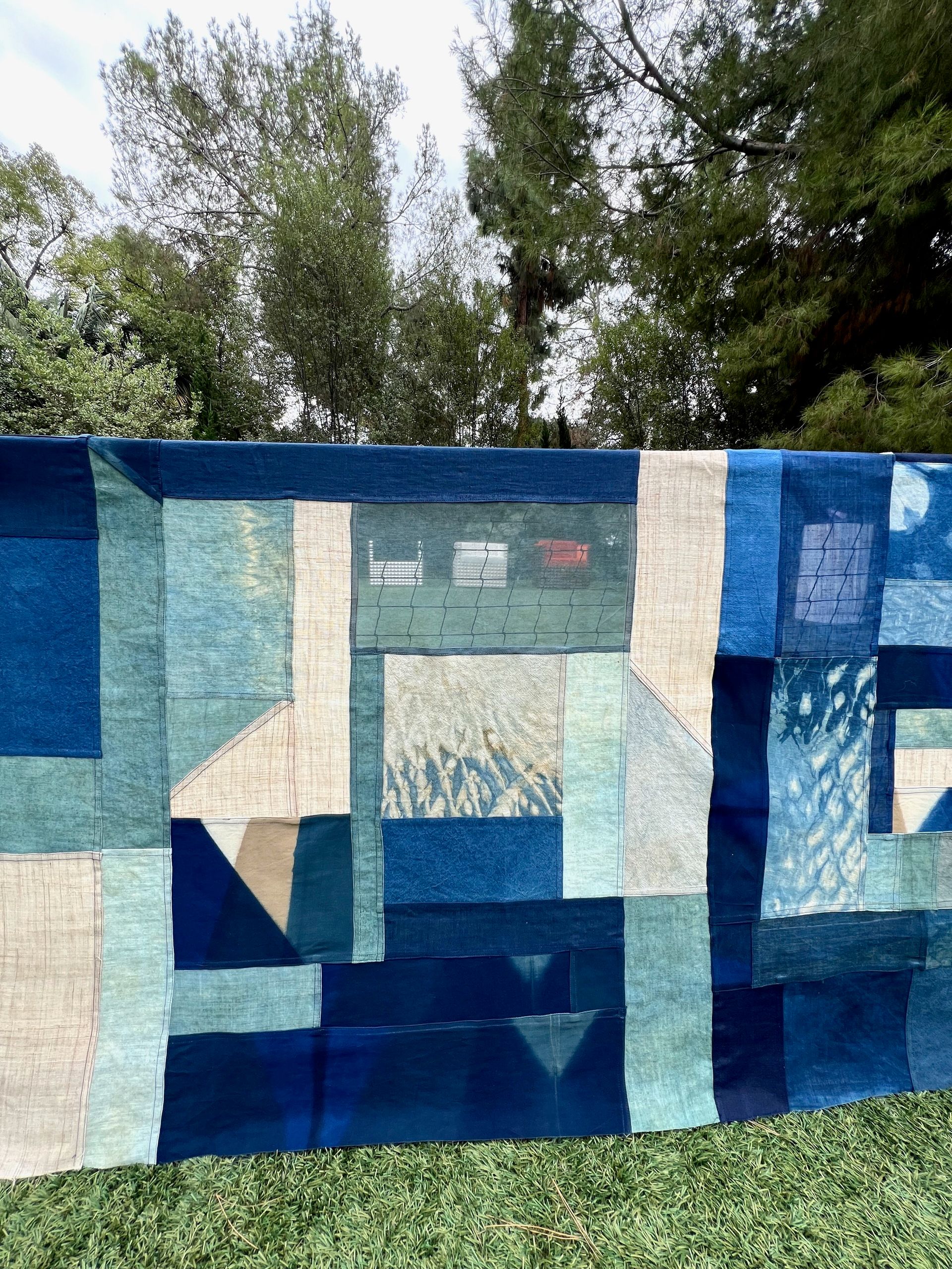 I’d love to share some photos of my large indigo piece installed on the grounds of Chet Architecture this past fall. It was in the show Infield, curated by Meaghan Roddy, that was part of LA Design Weekend. I hand sewed this piece to the existing tennis net! It’s comprised entirely of fabric dyed by me and indigo pieces from Japan, sewn jogakbo style. The piece is 3 feet by 24 feet! The largest I think I’ve ever made. I’ll have more opportunities to show it this year so I’m working out other methods of displaying it. There won’t always be a tennis court available.
